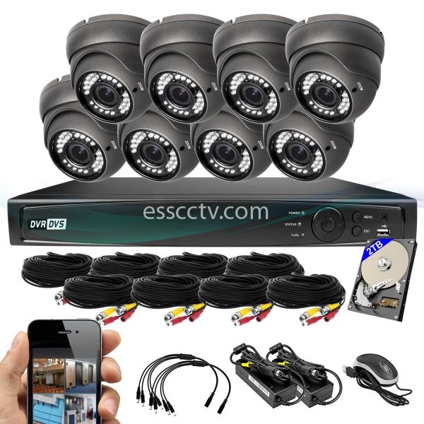 This surveillance kit includes a DVR with 8 channels of real-time record/playback, HD video out, live (remote) monitoring from mobile phone or web browser. The DVR supports motion detection and comes with a pre-installed 2TB hard drive for days of record time.